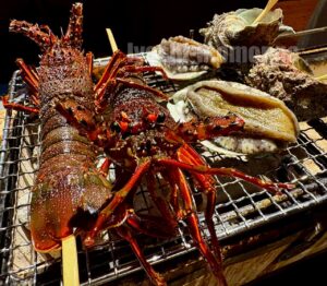 メインの房州海老(伊勢海老)、アワビ、サザエを炭火で🍽️