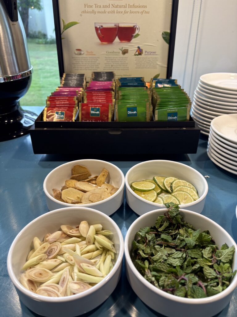 朝食時にはしょうがが入ったお茶はないかとたずねたところ、ベースの紅茶の種類や好みのカスタマイズを聞いてポッドでサーブしてくれたり、バーでもメニューにないスムージーを作ってくれたりしました。